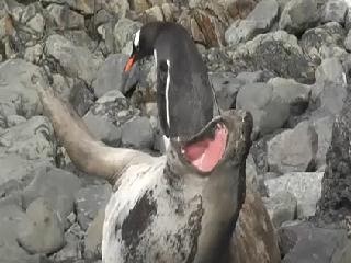 《夭壽喔 你還真的踩上去》白目企鵝誤把海狗當石頭踩>"<